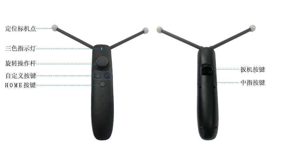 手柄有6个操作按键和1个旋转摇杆,HOME按键是手柄关机电源按键,自定义按键、中指按键和扳机按键由DEMO软件定义,具体功能参见DEMO使用说明。当手柄没电红灯闪烁时请及时充电,不使用的时候建议长按3S按键直接关机手柄。