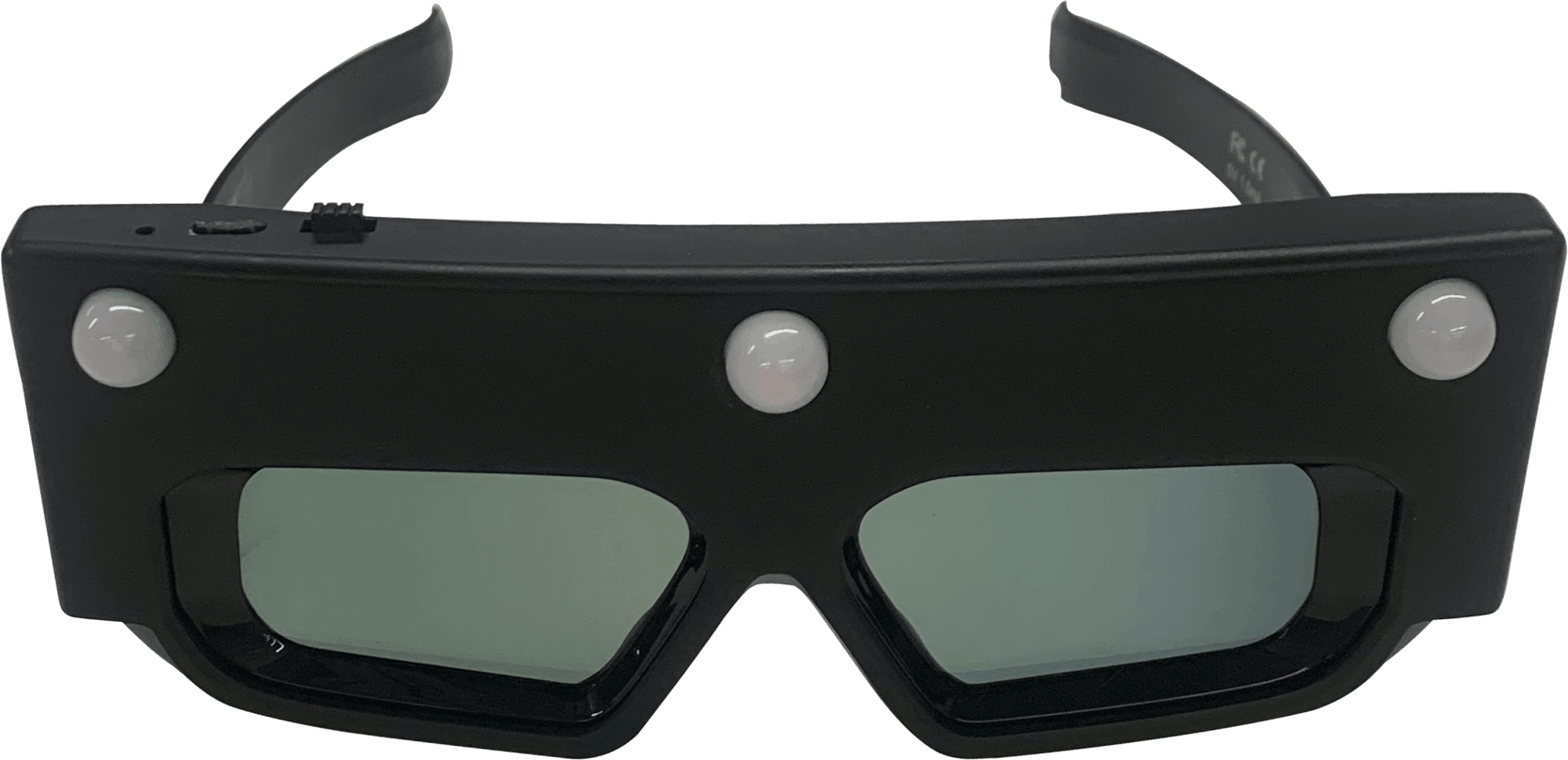 操作者手持手柄并佩戴带mark点3D眼镜 其他人员佩戴并观看无mark点3D眼镜