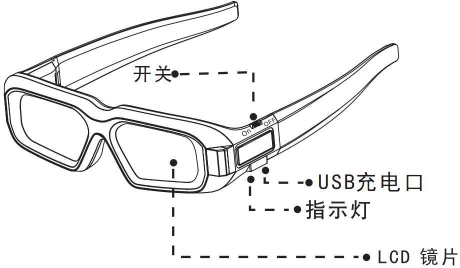 1. 将 3D 眼镜上的开关置于“ON”,打开 3D 眼镜,绿灯闪烁一次,表示眼镜进入开机状态,等待接收信号;眼镜出厂时已经校准到 120Hz 3D 模式,一般不需要其他操作。