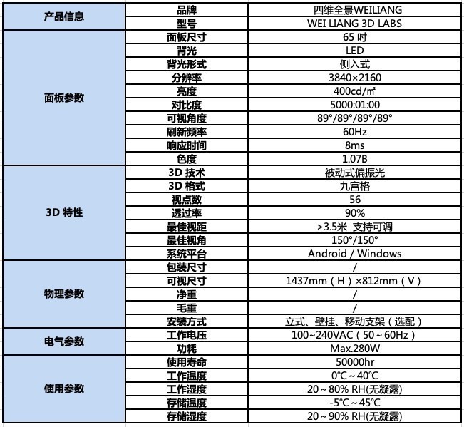 | RK3399 | 64位CPU,2.0GHz;4G+16G; | 支持横屏:支持九宫格、2D+Z、左右(单视点);支持竖屏,只支持九宫格 |