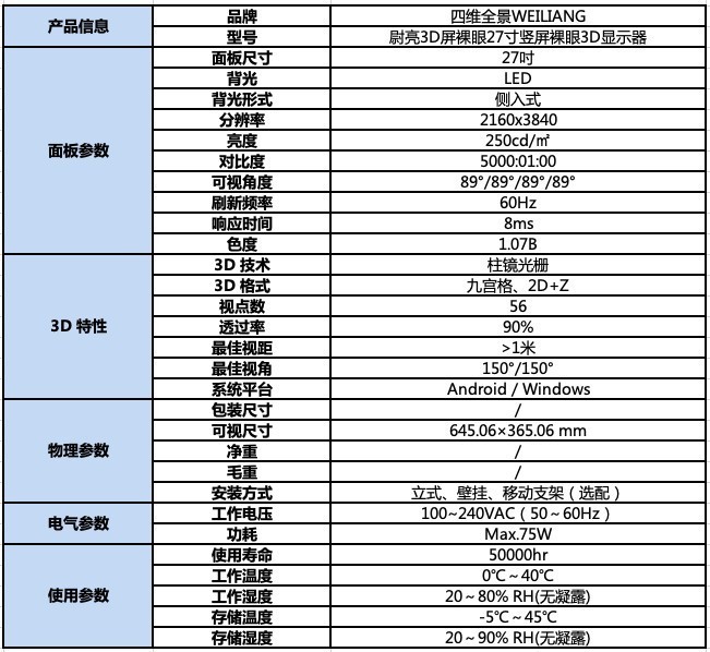 9、 观看最佳可视距离>0.5米,支持可调,水平方向3D可视角度150°。