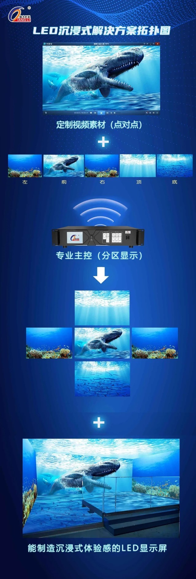 相对于常规显示屏项目而言,沉浸式屏幕对显示系统和设备都提出了更高的要求,因沉浸式项目各个屏幕面对观看台的安装角度不同、面与面之间的拼缝问题、设备之间的视频同步问题等,这就需要配备专业主控,将画面设置成分区显示(立体沉浸式),且支持各类高清信号源,可组合完成任意规模的LED显示屏,并配合校正软件,使得各面屏从观看台各角度看去效果能够趋于一致,从而提升观看体验,打造逼真的视觉效果。