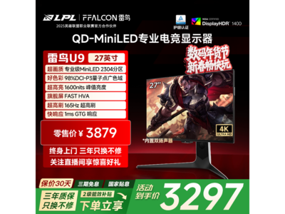 雷鸟27U9 27英寸QD - MiniLED显示器是一款性能出色的显示器。它具备4K分辨率,能呈现出清晰细腻的画面,无论是观影还是玩游戏,都能带来逼真的视觉体验。拥有165HZ高刷新率,可让画面切换更加流畅,减少画面撕裂和卡...[详情]